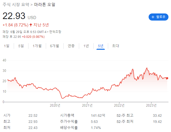 Marathon Oil Corporation 는 Fortune 500에 464번째에 랭크된 회사랭크된 회사이며 S&P 500에서는 400번째 위치한 회사로 안정적인 회사입니다.