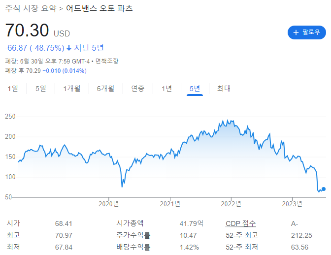 그러나 주식 투자와 관련된 자세한 정보나 최신 업데이트를 확인하려면 Advance Auto Parts, Inc의 공식 웹사이트나 금융 정보 제공 업체의 자료를 참고하는 것이 좋습니다.