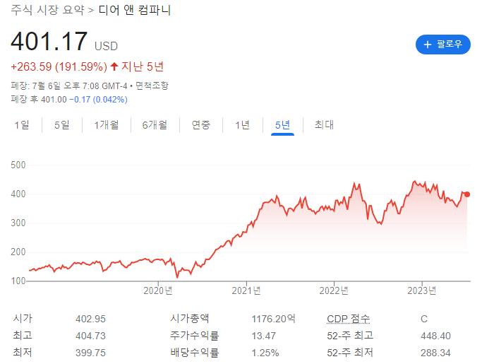 주식 투자에 앞서 디어 앤드 컴퍼니에 대한 자세한 분석과 시장 동향을 고려하는 것이 중요합니다. 이는 금융 전문가나 투자 자문가와 상의하거나 금융 정보를 참고하는 것이 좋습니다. 디어 앤드 컴퍼니의 재무 상태, 경쟁력, 성장 전망, 산업 동향 등을 평가하여 투자 결정을 내리는 것이 좋습니다.