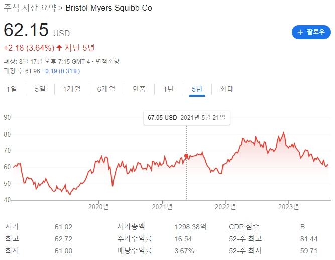 Bristol-Myers Squibb Co는 Fortune global 500에 95번째에 랭크된 회사이며 S&P 500에서는 57번째 위치한 회사로 안정적인 회사입니다.