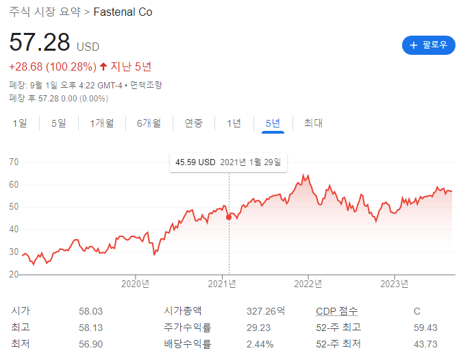 Fastenal Company는 Fortune 500에 514번째에 랭크된 회사이며 S&P 500에서는 233번째 위치한 회사로 안정적인 회사입니다.